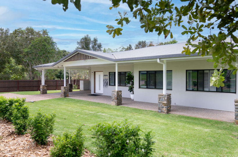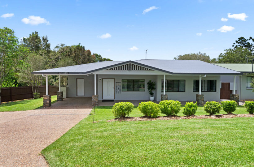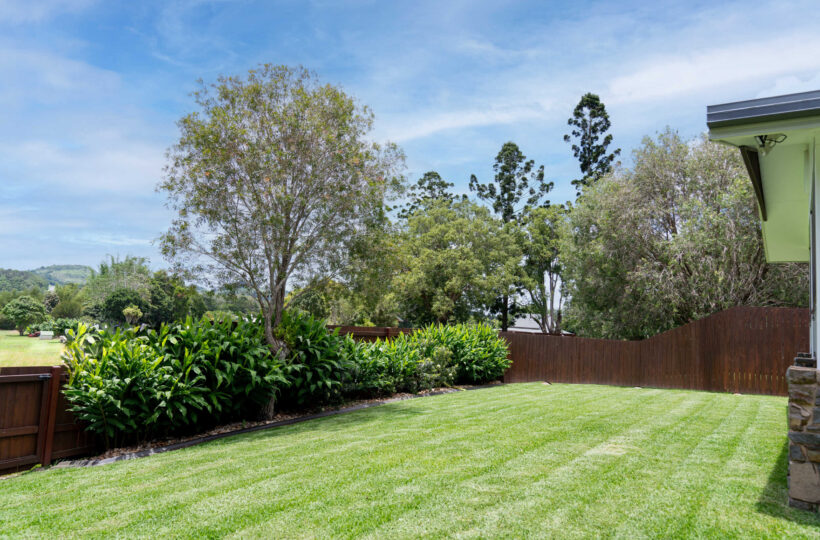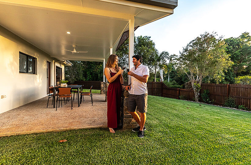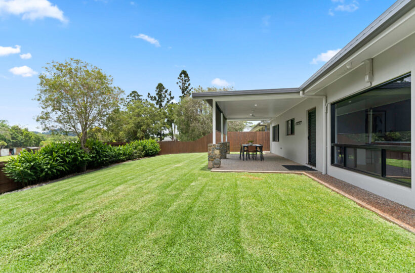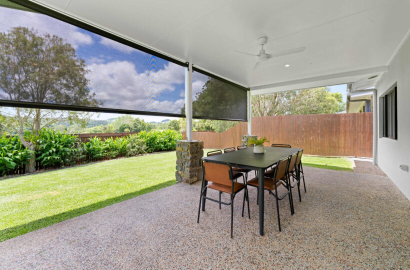 Outside is a fully covered rear patio with a 6 place outdoor setting perfect for late afternoon dinners or a glass of wine on dusk with views out over the backyard lawns to the stunning sunsets over Yungaburra.
